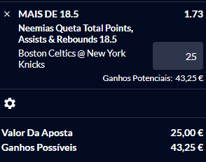 NY Knicks vs Boston Celtics – Aposta Especial Neemias Queta – 25 Outubro