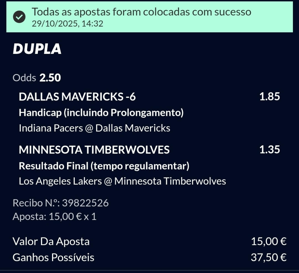 Aposta Acumuladora – Desafio 15€-250€ – Aposta 1 – 29 Outubro 2025