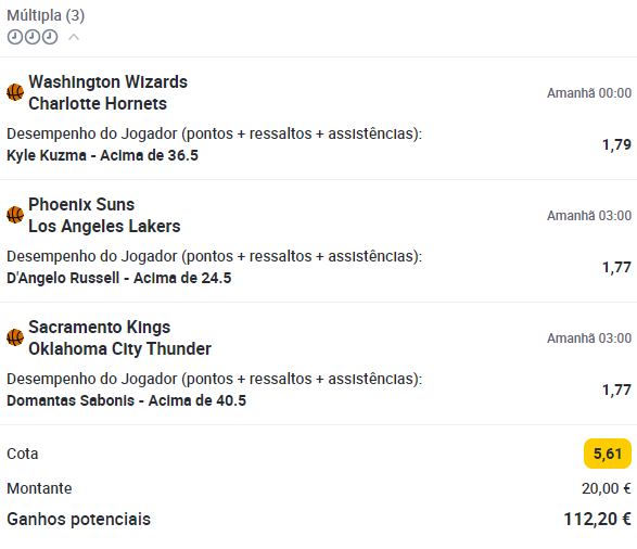 Hoje vamos lançar uma Aposta Dupla no mercado de Desempenhos individuais dos jogadores em Pontos + Ressaltos + Assistências. Para terem acesso a todas estas apostas, façam o registo na Betclic com o promocode NBAPTBETS e juntem-se ao nosso grupo de Telegram.