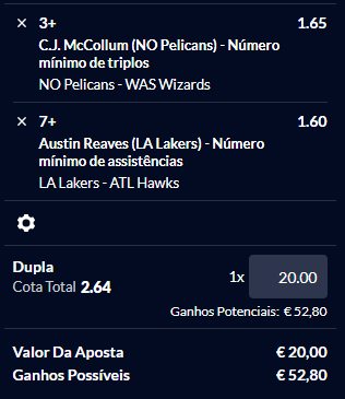 CJ ultrapassou esta linha em 70% dos jogos em casa esta época, com uma média de 3,5 triplos convertidos por jogo. Hoje enfrenta os Wizards, que são a 6ª equipa que mais permite triplos à posição de segundo base.