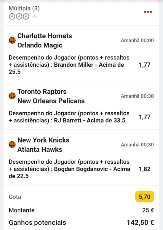 Para realizares esta aposta, vai ao jogo em questão na Betclic. Depois escolhe: Estatísticas » Performance » Desempenho do Jogador (pontos + ressaltos + assistências )