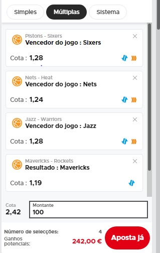 Apostas NBA Aposta Múltipla NBA! 23 Janeiro! Janeiro 23, 2021Janeiro 24, 2021 nbaportugal 0 Comments Um dia de jogos com equipas super favoritas a vencer. As seleções apresentam valores pequenos, mas em Aposta Múltipla o valor torna-se apetecível. Vamos acreditar que hoje não há surpresas.
