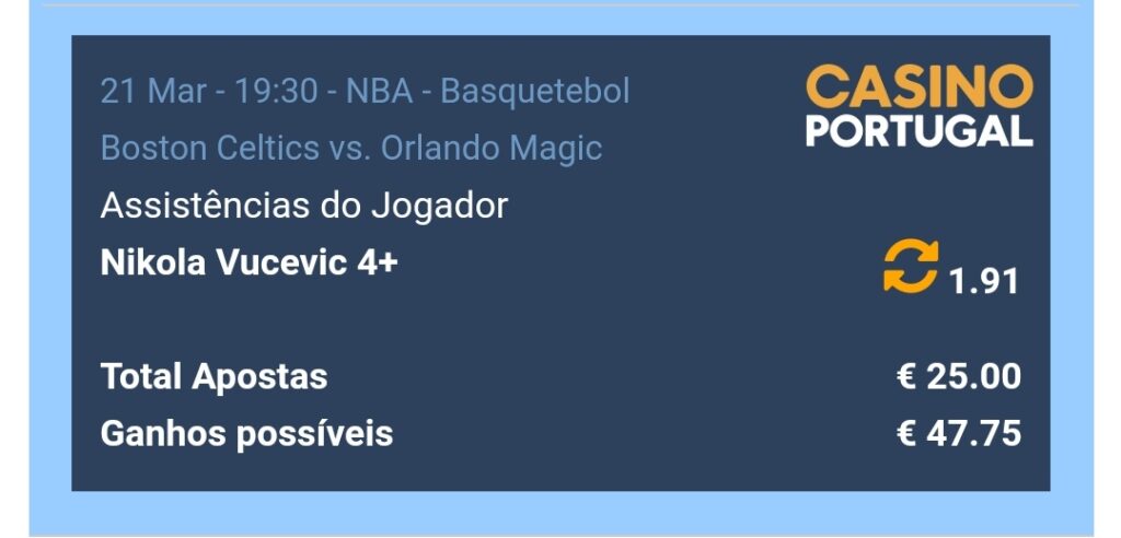 Apostas NBA Aposta Player Props NBA – 21 de Março Março 21, 2021Março 21, 2021 autores nbaportugal 0 Comments NBA, Nikola Vucevic, Playerprops Vucevic +3.5 assistencias – STAKE 0.5