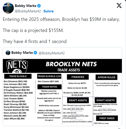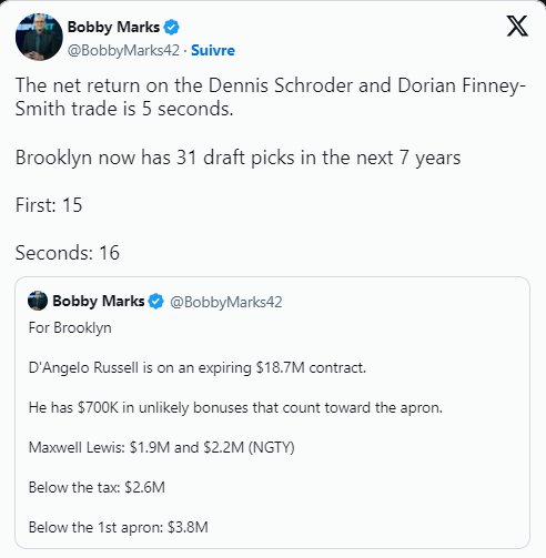 Em qualquer caso, os Brooklyn Nets têm toda a margem. D’Angelo Russell atingirá quase 19 milhões de dólares este ano, mas será agente livre no próximo ano. Os Nets têm uma opção de equipa em Maxwell Lewis, não são obrigados a manter.