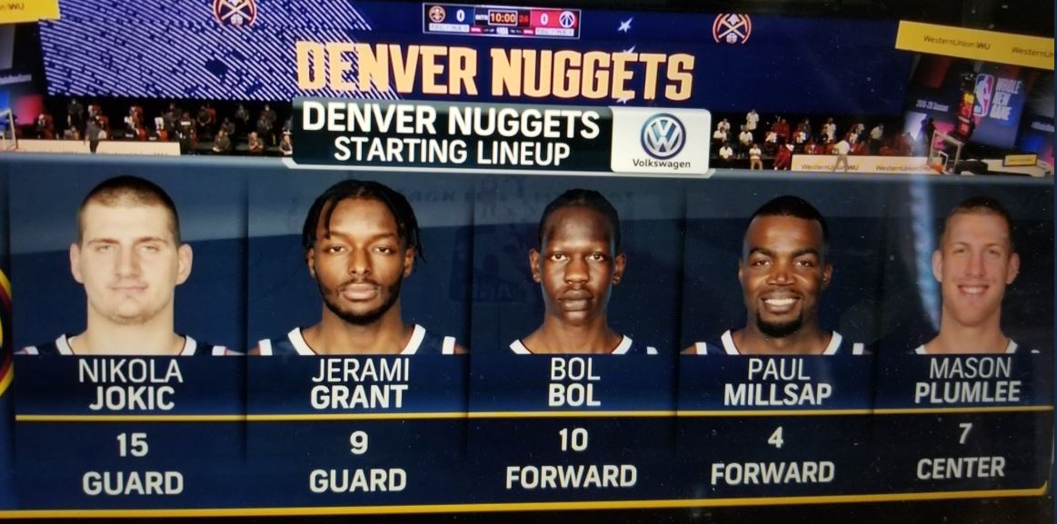No regresso dos jogos da NBA, ainda de preparação, os Denver Nuggets apresentaram-se com um inesperado cinco inicial, onde foi destaque a média de altura. A equipa começou com Jokic (2,13), Grant (2,03), Bol (2,18), Millsap (2,01), Plumlee (2,11).