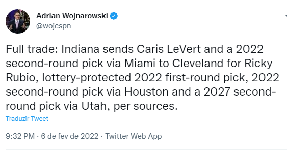 Por outro lado, Ricky Rubio, lesionado até ao final da temporada com uma grave lesão no joelho, é usado como moeda de troca com um contrato a expirar. O que os Pacers estavam a procurar obviamente são opções para o próximo Draft. Indiana conseguiu uma pick de 1ª ronda de 2022 (se estiver fora da lottery), uma pick de 2ª ronda de 2022 (de Houston), bem como outra de 2ª ronda de 2027 (dos Jazz). Além de LeVert, Cleveland também fica com uma pick de 2ª ronda de 2022 (de Miami).