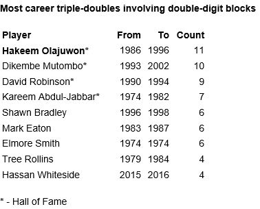 Podem ver aqui os jogadores com mais triplos duplos com blocos nas suas carreiras.