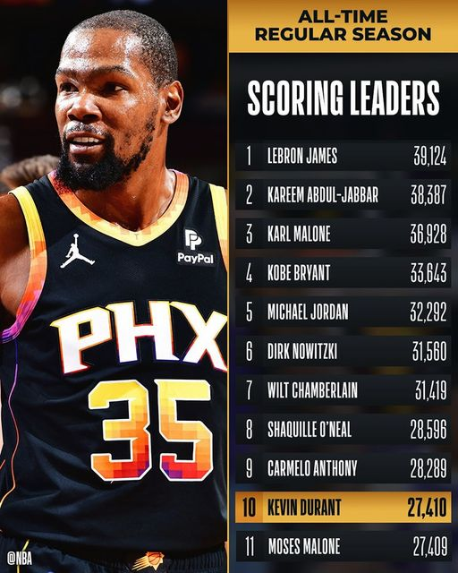 Kevin Durant conquistou 11 lugares desde o início da temporada 2022-2023. A estrela dos Suns ultrapassou muitas lendas no caminho, Tim Duncan e Hakeem Olajuwon, tal como Moses Malone esta sexta-feira.