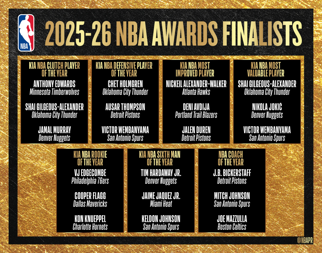 Os jornalistas e personalidades do basquetebol que fazem parte do painel de 100 votantes já entregaram os seus votos. A liga irá agora anunciar os vencedores ao longo dos próximos dias e semanas. Para já, revelou os três finalistas de cada prémio — ou seja, os jogadores mais votados em cada categoria.