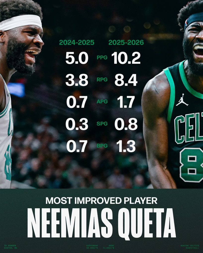 O português Neemias Queta por exemplo, atingiu um outro patamar. E por sua vez, Mazzulla consegue imaginar o poste como Most Improved Player, “Jogador que mais melhorou”, nesta temporada.
