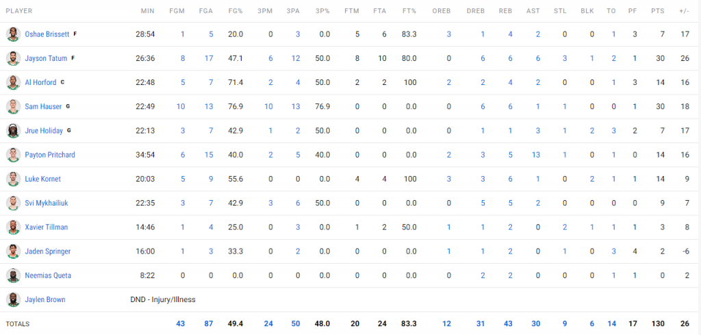 Os Boston Celtics voltaram a ter uma vitória expressiva (130-104), na última madrugada, desta vez frente aos Washington Wizards em DC. Apesar da ausência de três titulares, os Celtics continuam a fazer um grande registo na temporada, mostrando as muitas soluções no plantel. Ao intervalo, os Celtics já venciam por 28 pontos. Sam Hauser, teve um máximo de carreira com 30 pontos (10 triplos), ao qual se juntou os 30 pontos também Jayson Tatum. Jordan Poole, dos Wizards, foi o melhor marcador do jogo com 31 pontos.