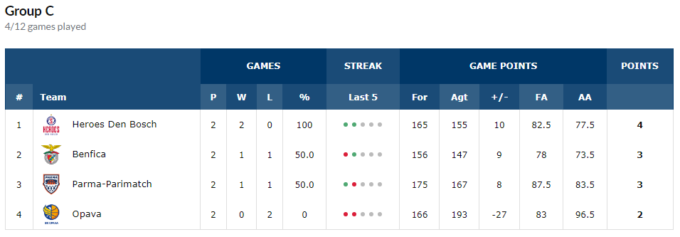 O Benfica venceu, mais uma vez em casa,desta vez os russos do Parma Perm por 83-69. Neste jogo a equipa portuguesa foi sempre superior, frente aos russos (que eram claramente favoritos) e conseguiram uma vitória muito importante para as contas no grupo. Destaque para Travis Munnings com 16 pontos, 6 ressaltos e 5 assistências, José Barbosa com 14 pontos e Aaron Broussard com 13 pontos, 7 ressaltos e 8 assistências.