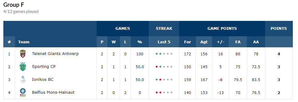 No caso do Sporting, venceram também em casa a equipa belga Belfius Mons por 75-65. Novamente a equipa visitante começou mais forte na 1ª parte, construindo uma vantagem ao intervalo (32-39), que viria a ser recuperada por uma 2ª parte muito superior do Sporting que acabou o encontro com a vitória por 10 pontos. Destaque para Joshua Patton com 22 pontos e Travante Williams com 20 pontos e 11 ressaltos.