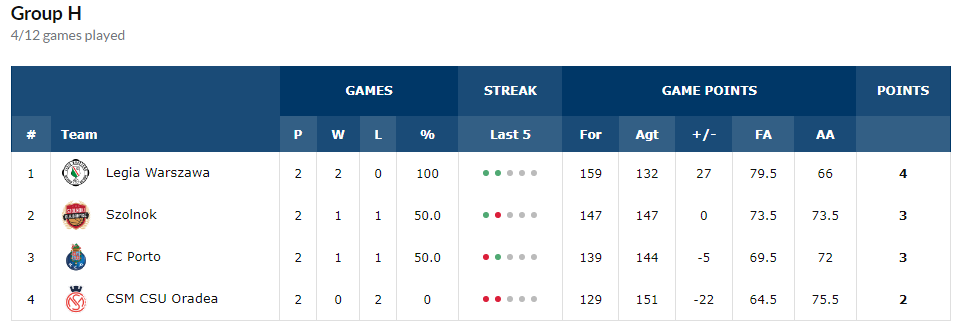 A equipa do Porto venceu em casa os romenos CSM Oradea por 75-63. Os romenos até entraram mais fortes no jogo na primeira parte, conseguindo um resultado positivo ao intervalo (33-38). Mas na segunda parte, os portistas dominaram o encontro e chegaram a uma vitória por 12 pontos de diferença. Destaque para Rashard Odomes com 22 pontos e 6 ressaltos e Max Landis com 15 pontos, 3 ressaltos e 4 assistências.