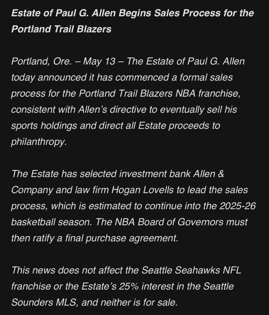Foi anunciado esta tarde que a empresa Paul G. Allen vai começar o processo de venda dos Portland Trail Blazers.