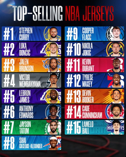 A NBA revelou o seu ranking das camisolas mais vendidas na temporada 2025-26, com uma mudança notável.