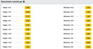 Os jogos NBA da madrugada de Sexta feira começo com a visita dos Washington Wizards aos Orlando Magic no Amway Center. Neste jogo os Wizards são dados como favoritos pelo handicap de -2.5 pontos. A linha de total de pontos no encontro está situada nos 219 pontos.