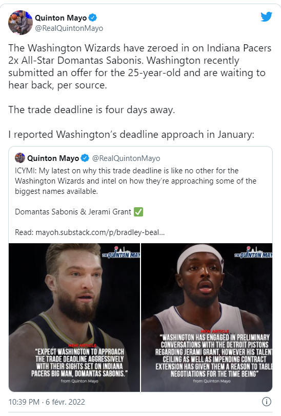 Domantas Sabonis terá jogado o seu último jogo pelos Indiana Pacers no domingo em Cleveland? Os Washington Wizards claramente esperam que sim. Segundo o jornalista Quinton Mayo, a equipa da capital federal apresentou uma oferta pelo lituano para conseguir o jogador antes do prazo de trocas que está a terminar.
